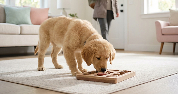 – Start Early: From 2 months of age, practice leaving the puppy alone for 10–15 minutes at a time.