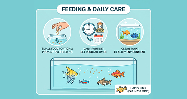 - Feed fish small amounts of food daily basis. It’s the owner responsibility to ensure they are not over fed.