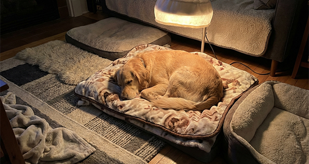 • A heating blanket or warm light source can also be However, ensure that the heat source is not too hot, else it could lead to burns or result in a fire. The heat source should be kept secure, and not have any open wires or points of contact which could injure the pet. Always check the temperature of your pet , the ambient temperature, and watch for signs of discomfort or stress related behaviour. Extra mats and pet blankets can also be provided. The mats also prevent them from slipping on the floor, thereby reducing the impact on the joints and minimizing damage in case of already existing conditions like Hip dysplasia.